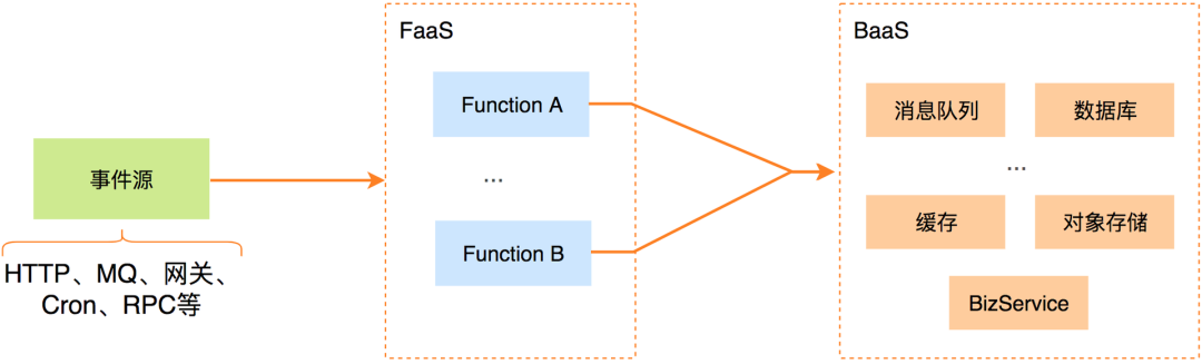 FaaS:是运行在一个无状态的计算容器中的函数服务,函数通常是事件驱动、生命周期很短(甚至只有一次调用)、完全由第三方管理的。业界相关FaaS产品有AWS的Lambda、阿里云的函数计算等。