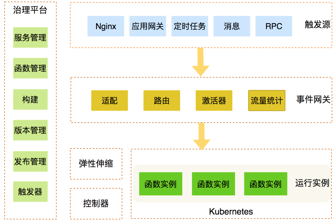 弹性伸缩:核心能力是负责函数实例的弹性伸缩,伸缩主要根据函数运行的流量数据以及实例阈值配置计算函数目标实例个数,然后借助Kubernetes的资源控制能力,调整函数实例的个数。