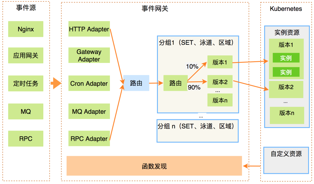 函数路由:事件流量的路由过程,路由到特定的函数实例上。这里为了支持传统路由逻辑(如SET、泳道、区域路由等)以及版本路由能力,我们采用了多层路由,第一层路由到分组(SET、泳道、区域路由),第二层路由到具体版本。同版本内的实例,通过负载均衡器选择出具体实例。另外,通过该版本路由,我们很轻松的支持了金丝雀、蓝绿发布。