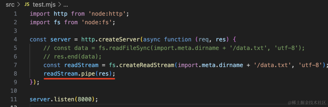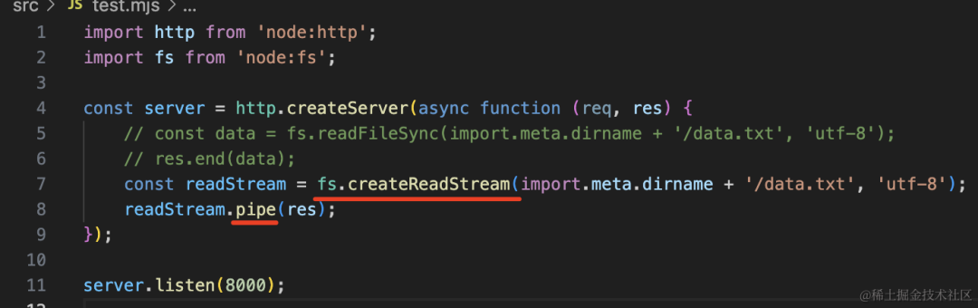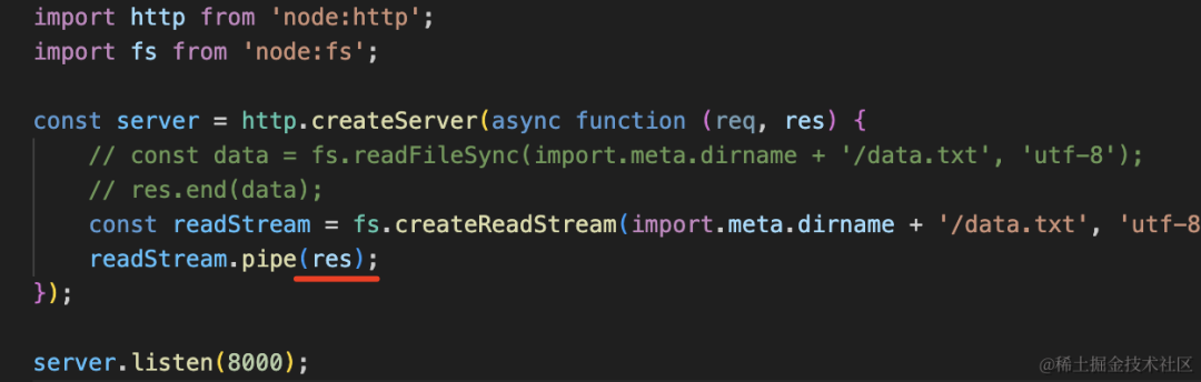 readStream.pipe(res);我们用 fs.createReadStream 创建文件读取流,然后 pipe 到响应的流。
