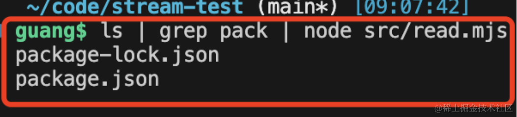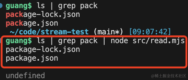 可以看到,我们的 node 脚本接收到了 grep 的输出流作为输入流。