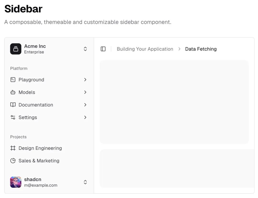 近期 Shadcn UI 作者还发布了一个功能强大的 Sidebar 组件,有了这个组件,我们就能方便地根据需求自定义 Sidebar 了。