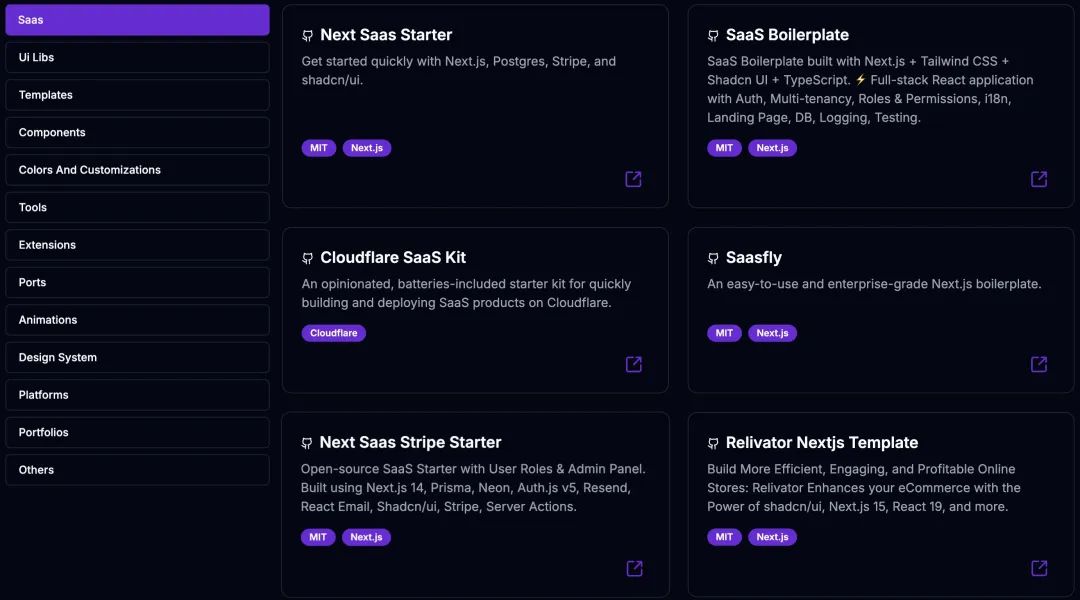Awesome Shadcn UI 目前包含与 Shadcn UI 有关的 200 多个资源,共 13 个分类。涉及 UI 组件库、Landing Page 模板、SaaS 模板(接入用户认证、支付、数据库等)、Shadcn 扩展、Shadcn 工具等。