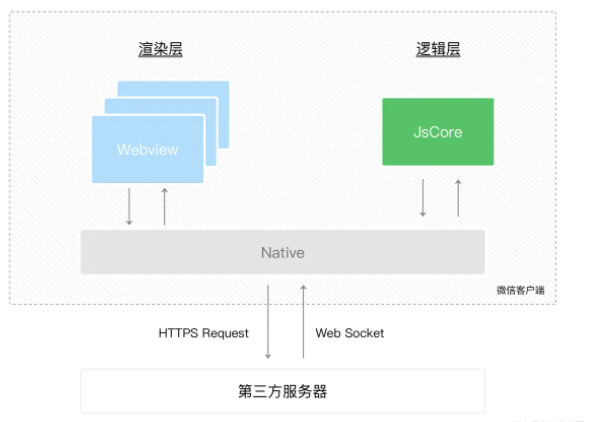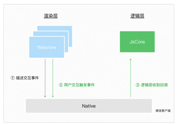 而在小程序中,选择了 Hybrid 的渲染方式,将视图层和逻辑层是分开的,双线程同时运行,视图层的界面使用 WebView 进行渲染,逻辑层运行在 JSCore 中