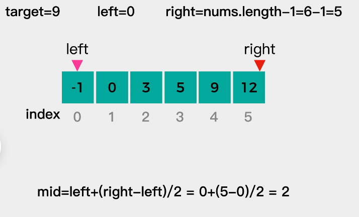 - 每次取查找范围的中点 mid,比较 nums[mid] 和 target的大小,如果相等则 mid即为要寻找的下标。