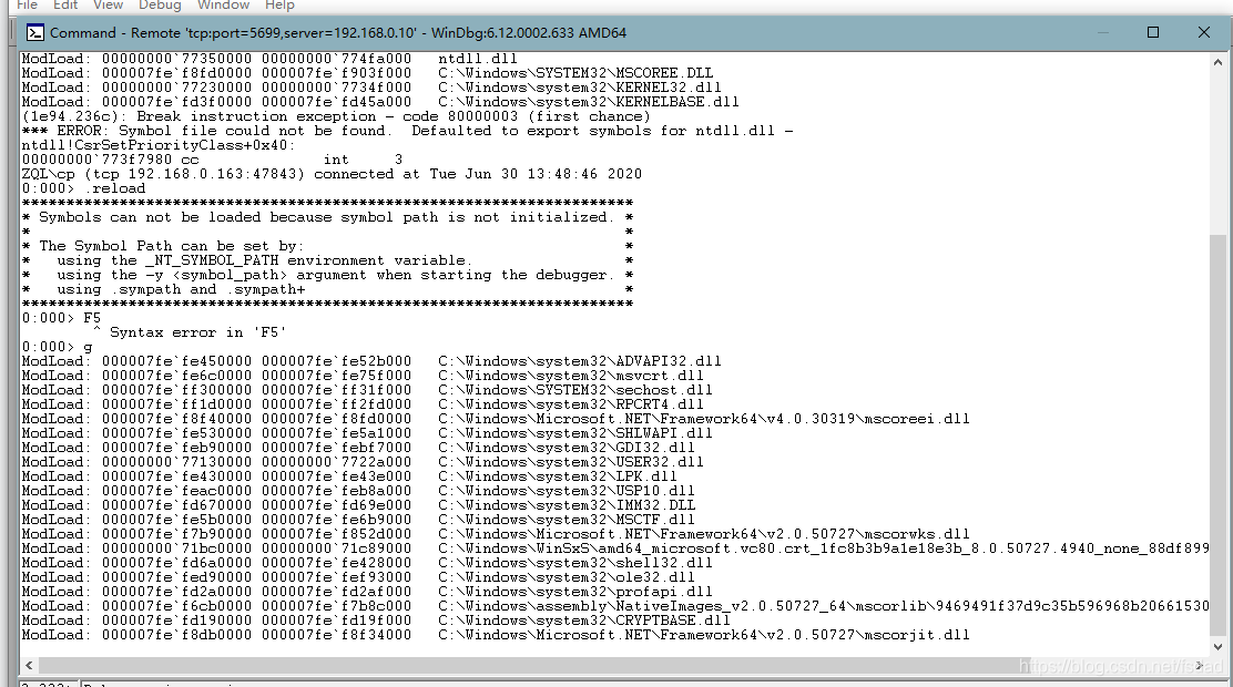windbg –remote tcp:port=5699,server=192.168.0.10