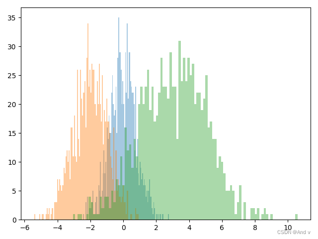 kwargs=dict(bins=100,alpha=0.4) # alpha:图形的透明度