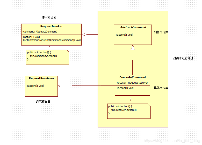 命令模式将请求发送者和请求接收者完全解耦,发送者和接受者之间没有直接引用关系,发送请求的对象只要知道如何发送请求,而不必知道请求是如何完成的。