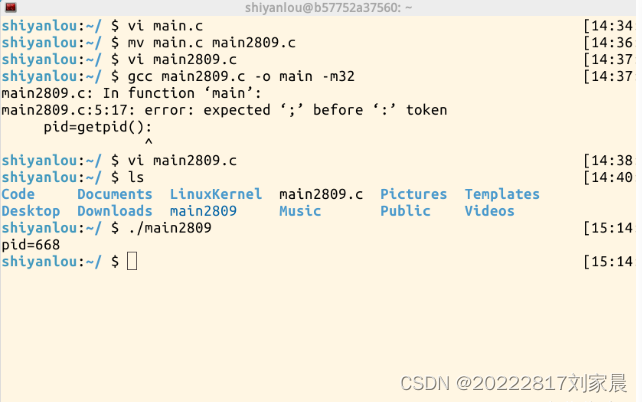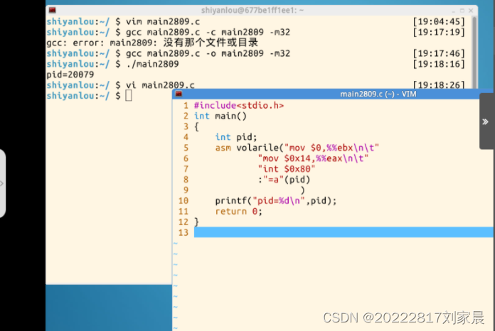 asm volatile( "movl %1,%%ebx\n\t" /*把oldname存入EBX寄存器中*/ "movl %2,%%ecx\n\t" /*把newname存入ECX寄存器中*/ "movl $0x26,%%eax\n\t" /*把系统调用号38存入EAX寄存器中*/ "int $0x80\n\t" /*触发系统调用陷入内核执行38号系统调用的内核处理函数*/ :"=a"(ret) :"b"(oldname),"c"(newname) ); ```  - 库函数API进行触发 利用库函数API触发rename系统调用将上述改名后的www20212809.c改回www.c。