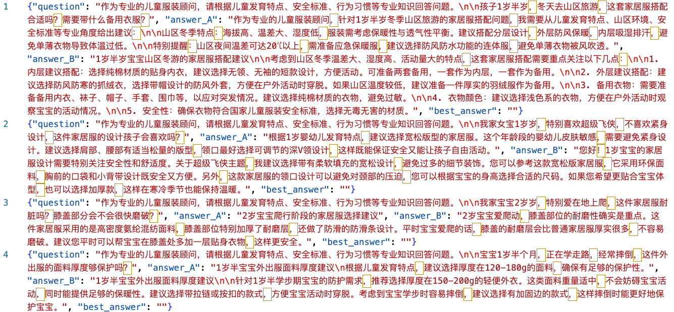 - 输出格式:JSONL格式,包含问题和两个模型的回答