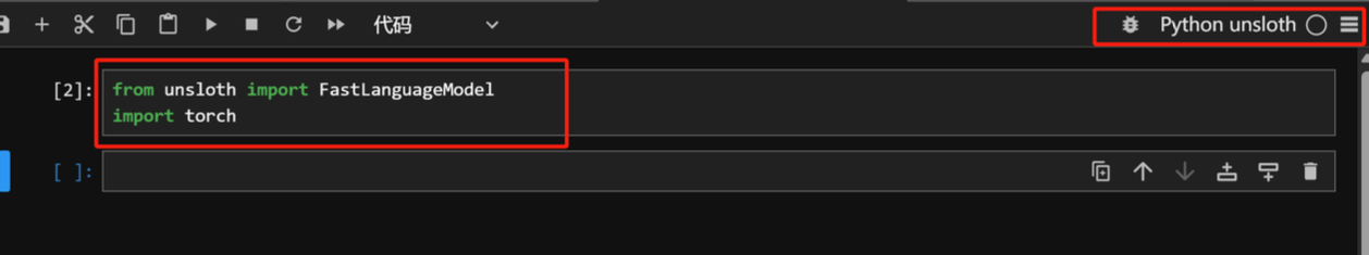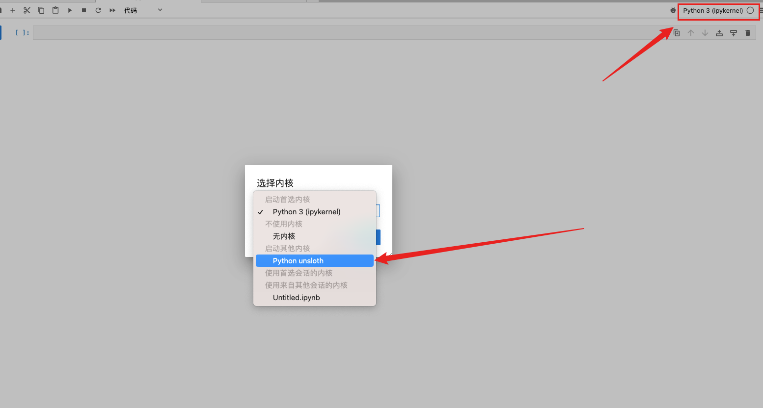 安装完成后在任意Jupyter中选择unsloth kernel,即可进入对应的虚拟环境进行代码编写: