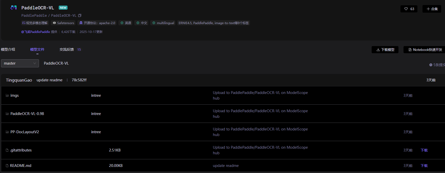 ModelScope地址(推荐国内用户):https://modelscope.cn/models/PaddlePaddle/PaddleOCR-VL/summary