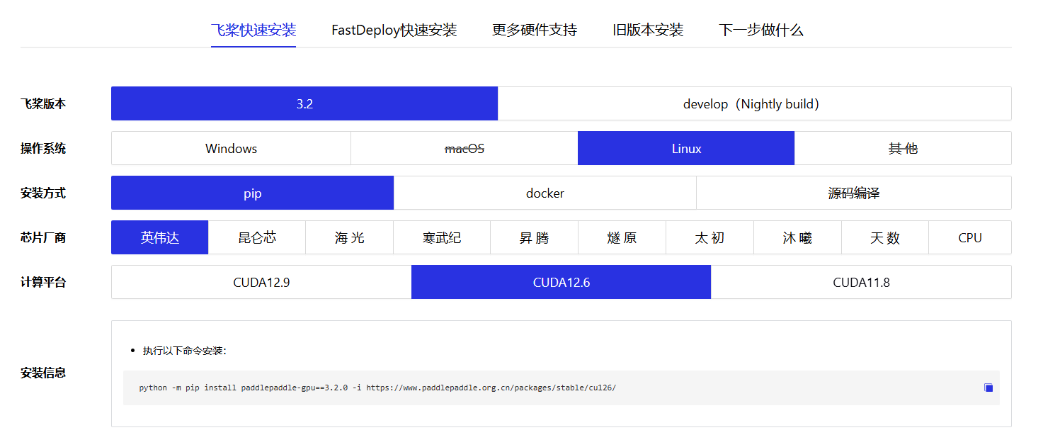 访问PaddlePaddle官网选择合适的安装命令:https://www.paddlepaddle.org.cn/install/quick?docurl=/documentation/docs/zh/develop/install/pip/linux-pip.html