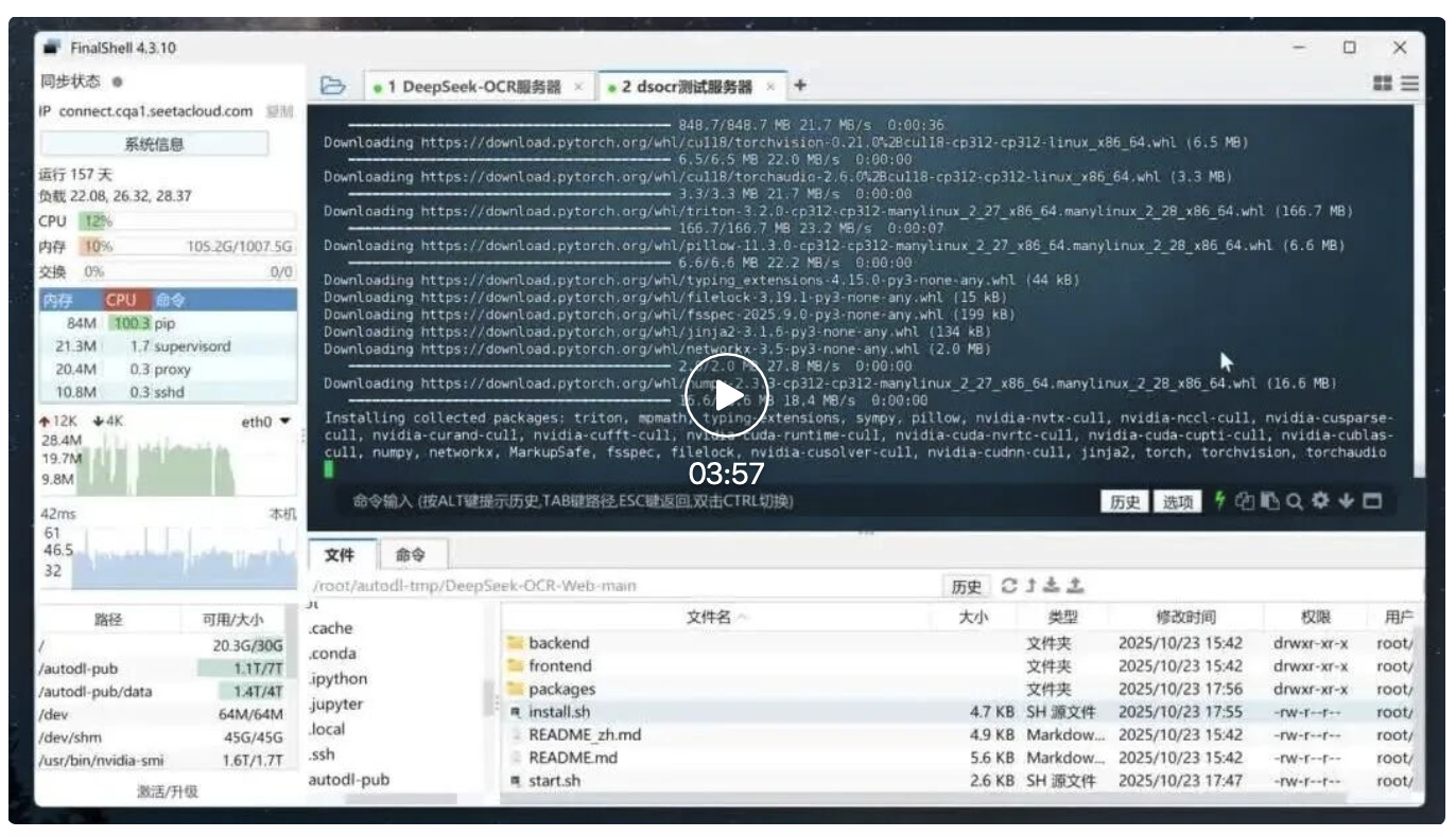 该脚本能够一键完成DeepSeek-OCR模型环境搭建、依赖安装、模型权重下载、前端环境搭建和依赖安装等各项工作,并且运行稳定,还适配了国内网络环境。怎么样,是不是非常便捷。而由于这个要下载模型权重,所以实际运行时间可能需要20分钟左右。