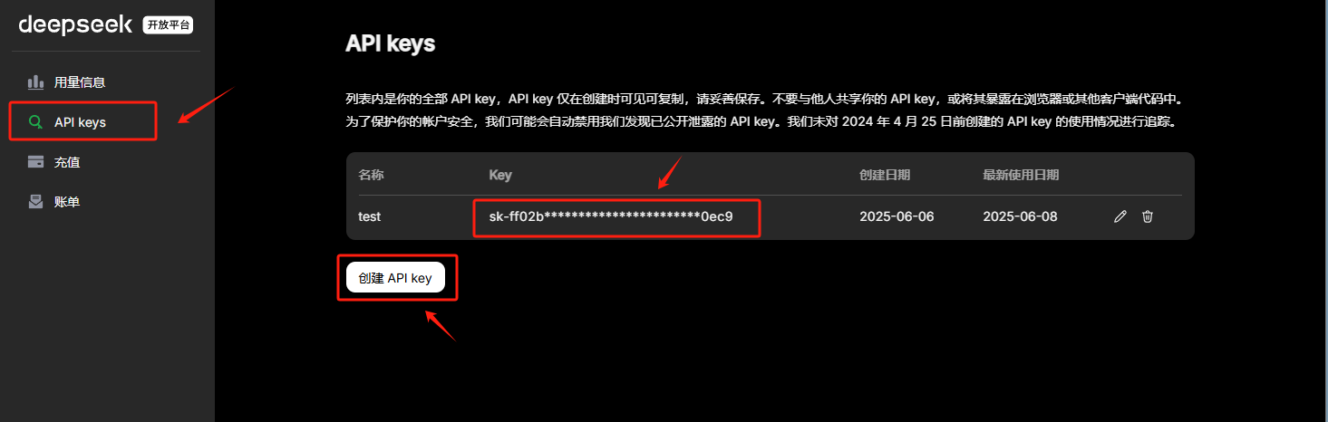 首先注册 DeepSeek 账号并获取 API Key( https://platform.deepseek.com/usage )。