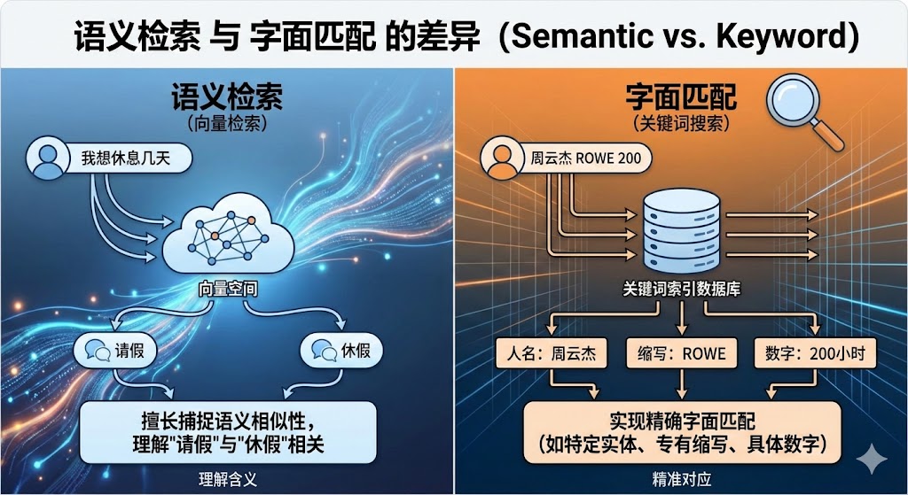 纯粹的向量检索擅长捕捉语义上的相似性,例如能理解“请假”和“休假”是相关的。