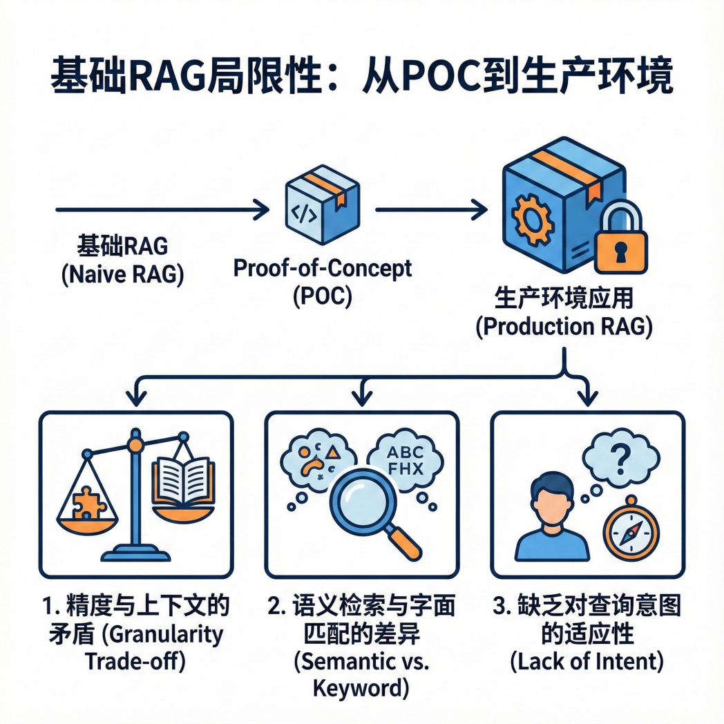 这是无数开发者在构建 RAG(检索增强生成)应用时面临的真实崩溃瞬间。在 POC(概念验证)阶段,基础 RAG 看起来无所不能。然而,一旦面对真实的生产环境——复杂的用户查询、晦涩的行业术语、海量的非结构化数据——基础 RAG 往往瞬间暴露出致命的脆弱性。
