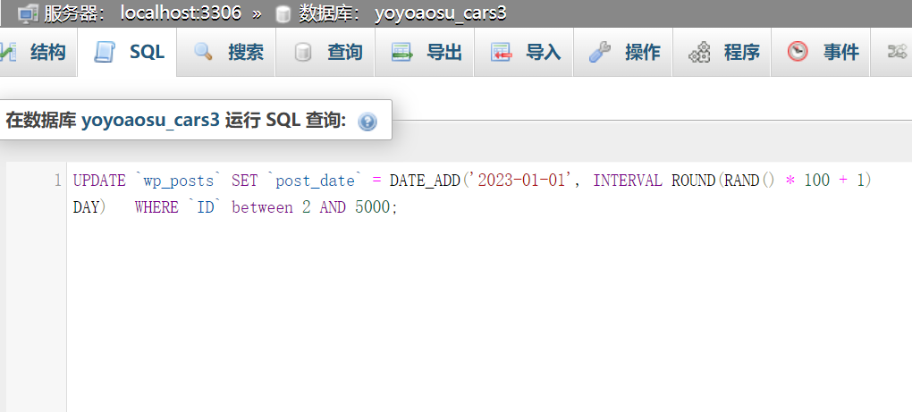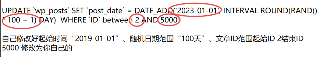 自己修改,起始时间是“2023-01-01”、随机日期范围“100天”、文章ID范围起始ID 2结束ID 5000 (如果你的网站文章多超过了5000就改为最后文章的ID数字)