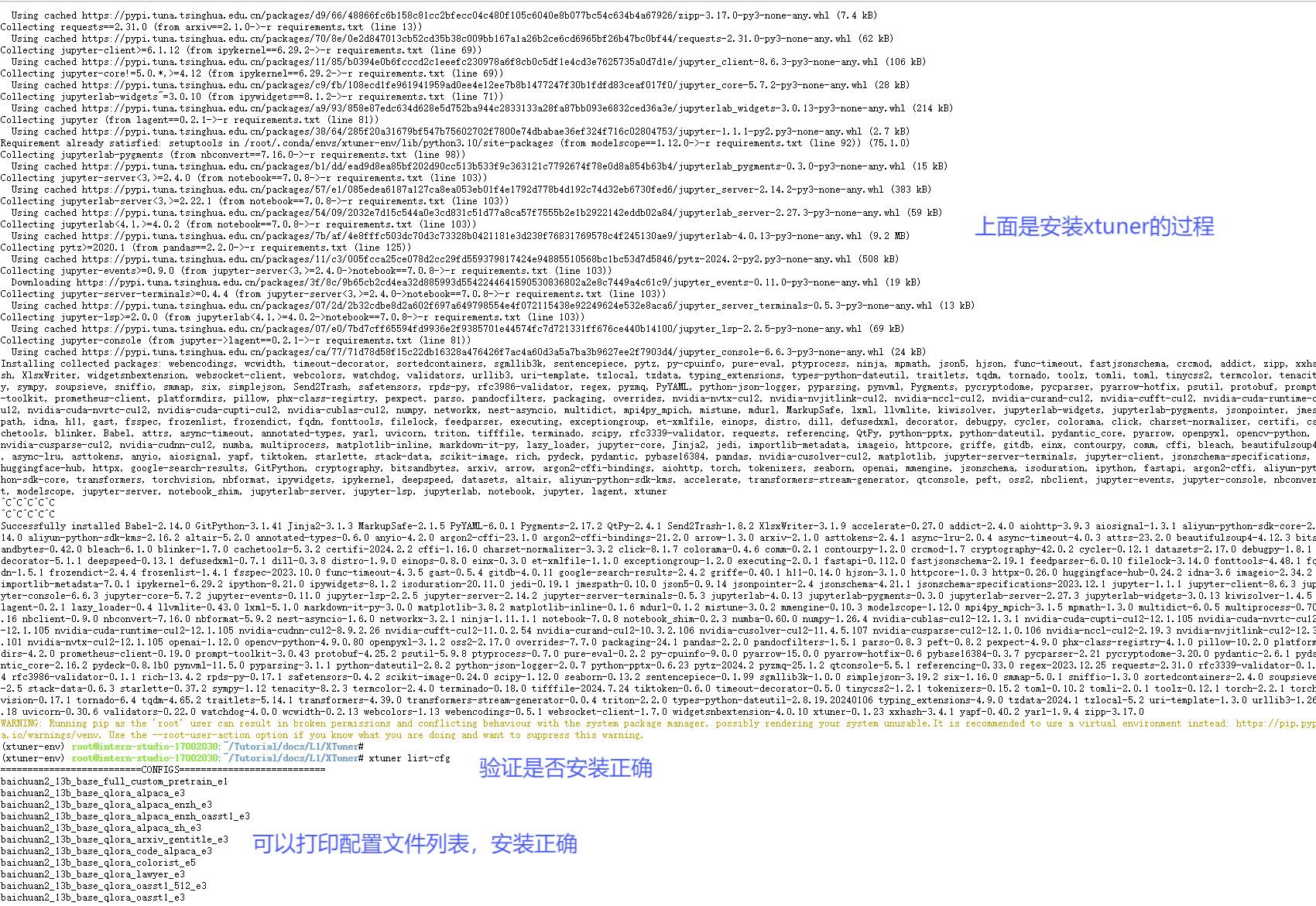 为了验证 XTuner 是否安装正确,我们将使用命令打印配置文件。