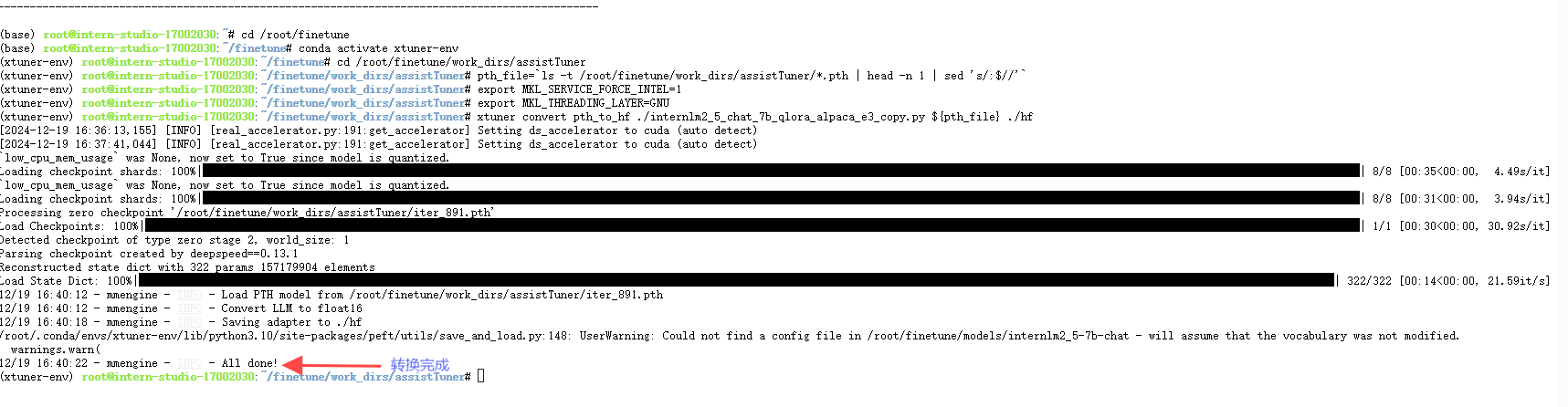 我们可以使用 xtuner convert pth_to_hf 命令来进行模型格式转换。\
