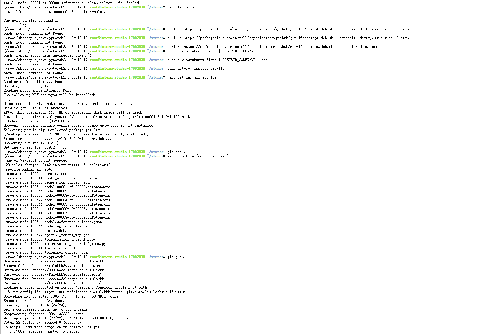 需注意,开发机每次重启后都不会保留lfs工具,所以上传前需要重新下载