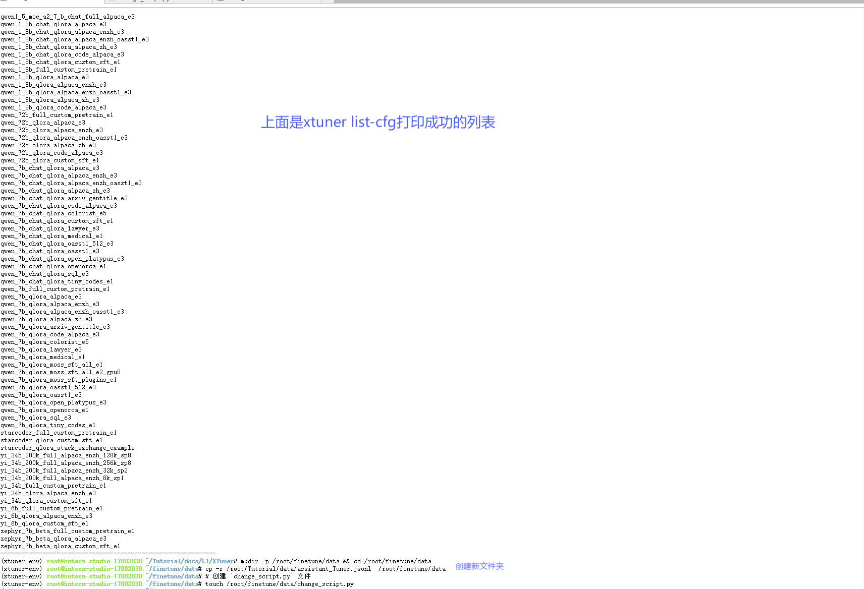 打印配置文件: 在命令行中使用 xtuner list-cfg 验证是否能打印配置文件列表。