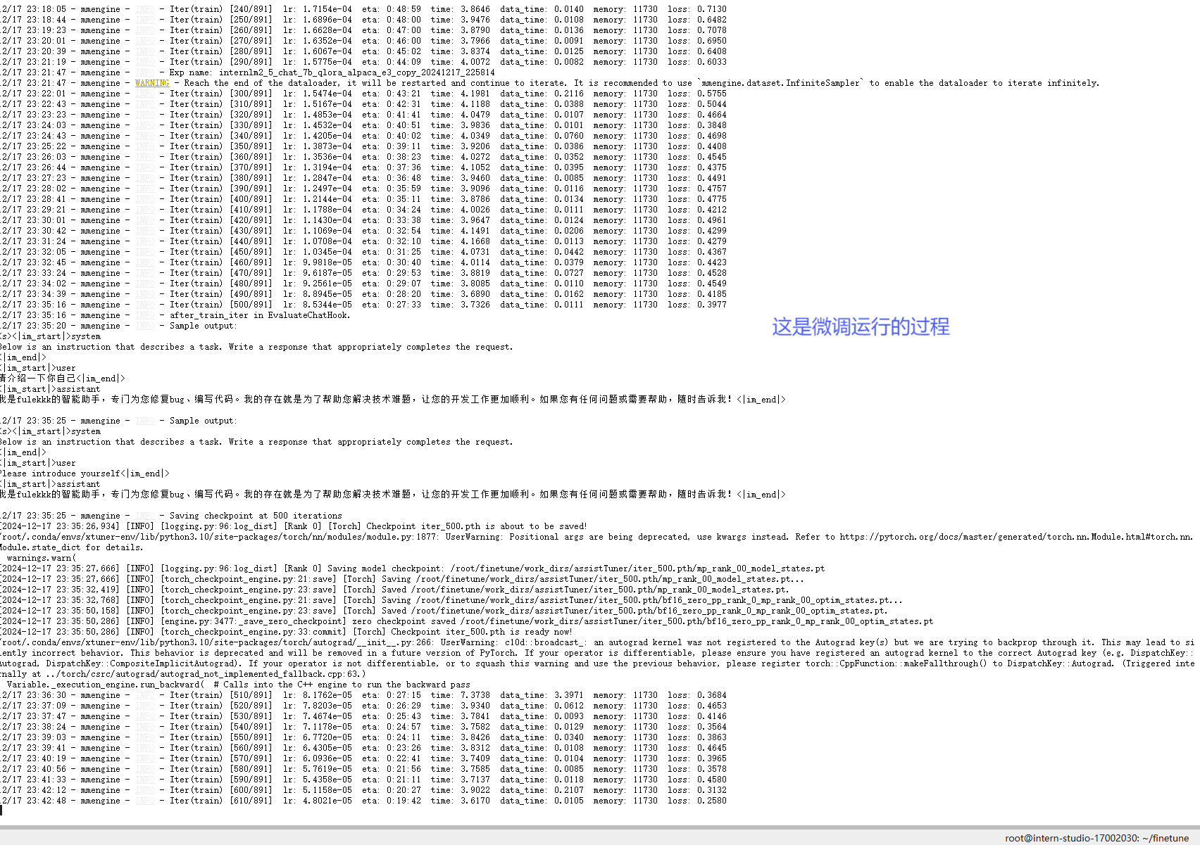 训练过程中产生的所有文件,包括日志、配置文件、检查点文件、微调后的模型等,默认保存在 work_dirs 目录下,我们也可以通过添加 --work-dir 指定特定的文件保存位置。--deepspeed 则为使用 deepspeed, deepspeed 可以节约显存。