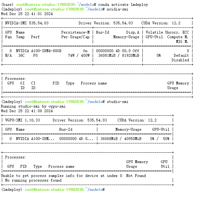 注释:实验室提供的环境为虚拟化的显存,nvidia-smi是NVIDIA GPU驱动程序的一部分,用于显示NVIDIA GPU的当前状态,故当前环境只能看80GB单卡 A100 显存使用情况,无法观测虚拟化后30%或50%A100等的显存情况。针对于此,实验室提供了studio-smi 命令工具,能够观测到虚拟化后的显存使用情况。