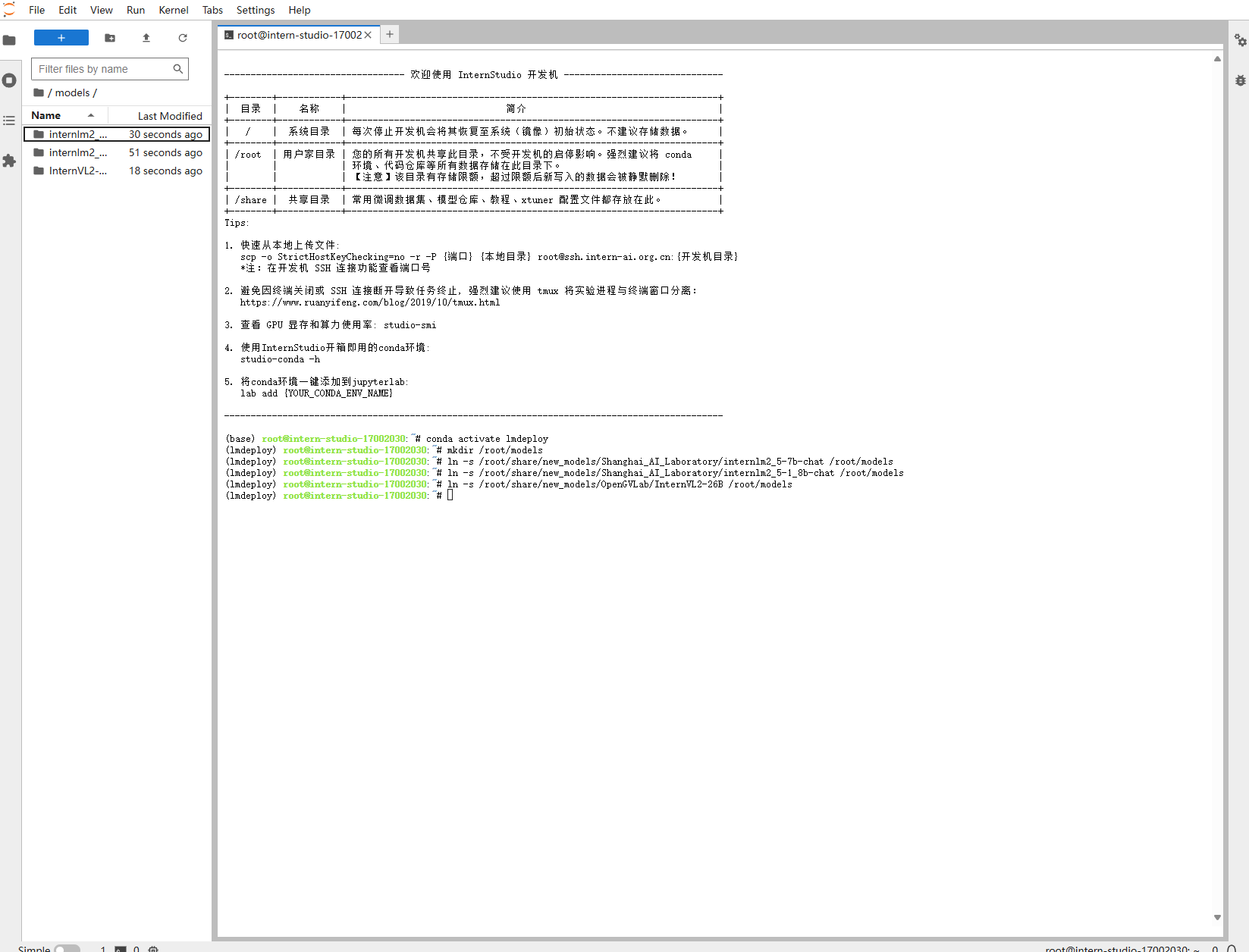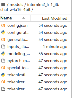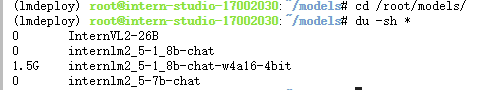 可以看到/root/models中会出现internlm2_5-7b-chat、internlm2_5-1_8b-chat和InternVL2-26B文件夹。
