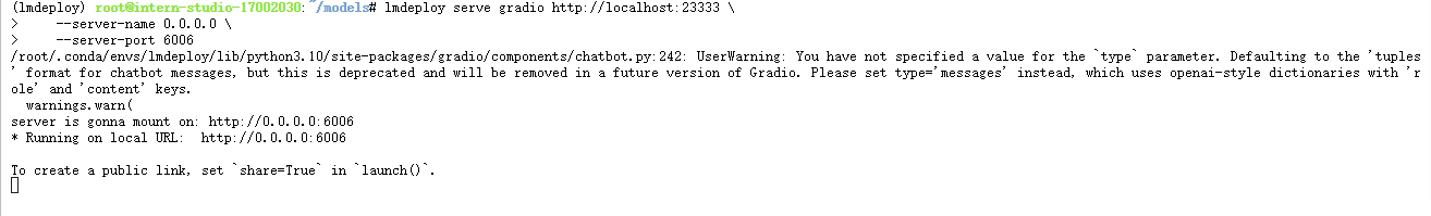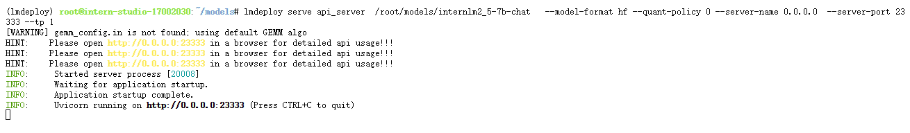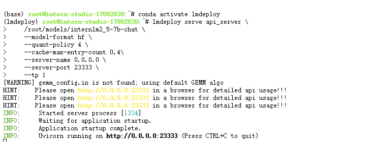 lmdeploy serve api_server:这个命令用于启动API服务器。/root/models/internlm2_5-7b-chat:这是模型的路径。--model-format hf:这个参数指定了模型的格式。hf代表“Hugging Face”格式。--quant-policy 0:这个参数指定了量化策略。--server-name 0.0.0.0:这个参数指定了服务器的名称。在这里,0.0.0.0是一个特殊的IP地址,它表示所有网络接口。--server-port 23333:这个参数指定了服务器的端口号。在这里,23333是服务器将监听的端口号。--tp 1:这个参数表示并行数量(GPU数量)。
