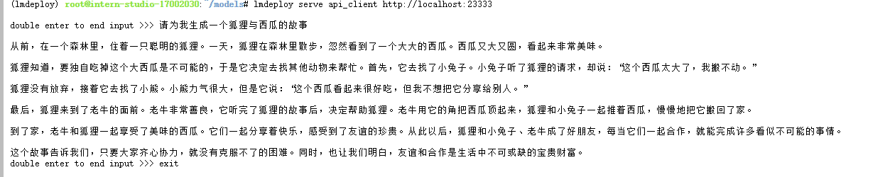 稍待片刻,等出现double enter to end input >>>的输入提示即启动成功,此时便可以随意与InternLM2.5对话,同样是两下回车确定,输入exit退出。