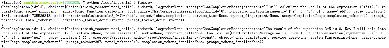 我们可以看出InternLM2.5将输入'Compute (3+5)*2'根据提供的function拆分成了"加"和"乘"两步,第一步调用function add实现加,再于第二步调用function mul实现乘,再最终输出结果16.