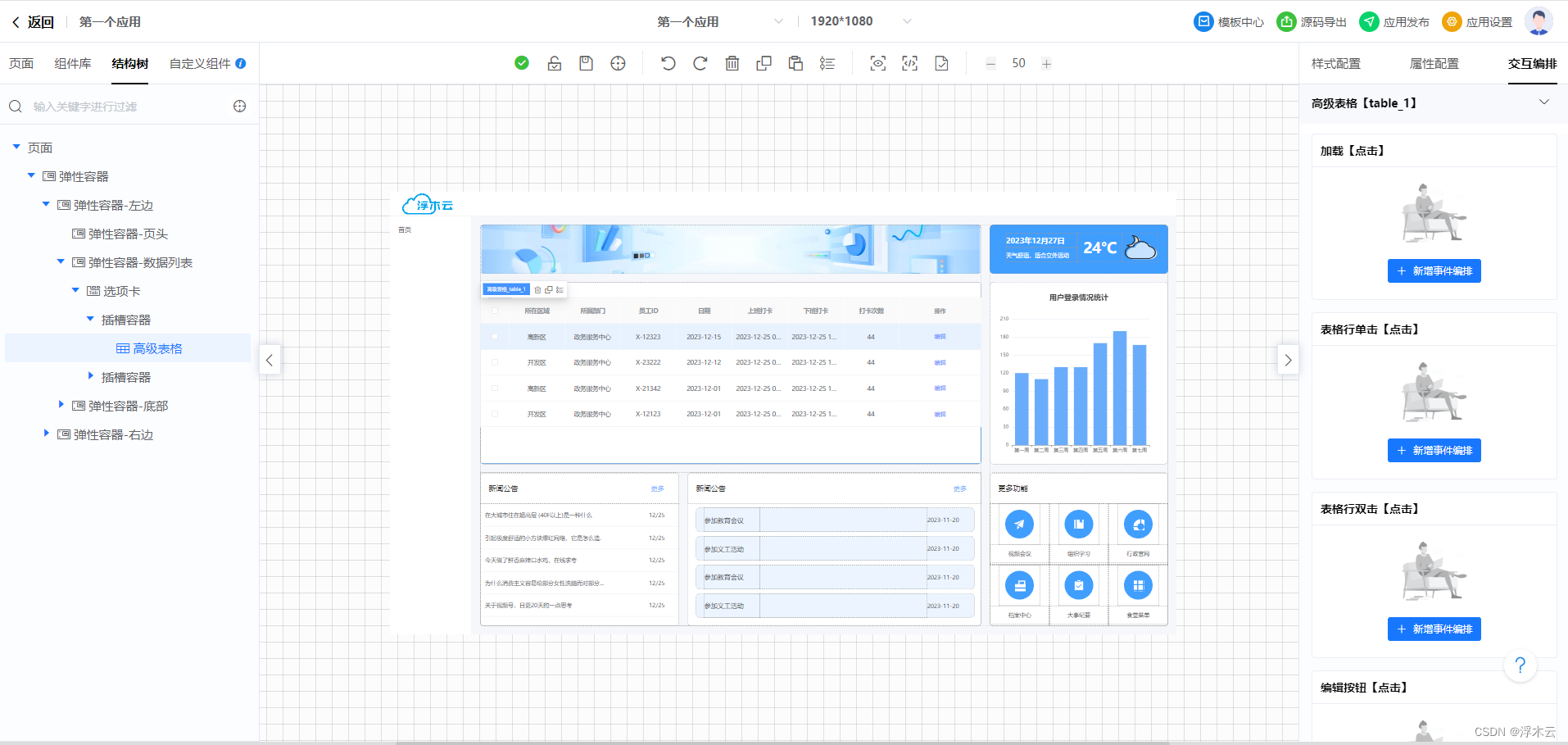 首先我们以一个高级表格为例,左边标签卡上选择结构树中找到表格,或者直接通过页面点击表格组件,在右边的交互编排中即可看到对于表格的交互配置