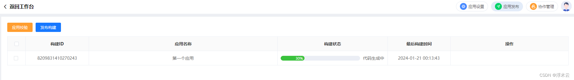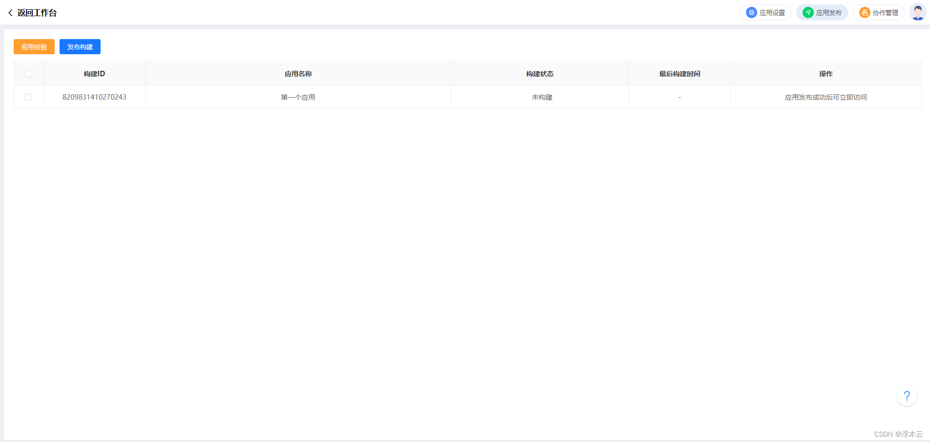 在线构建是浮木云第二个产品设计-软件原型全流程打通的第二个关键点,通过在线构建,我们可以直接对原型进行构建并查看构建后直接部署到浮木云服务器的页面软件应用