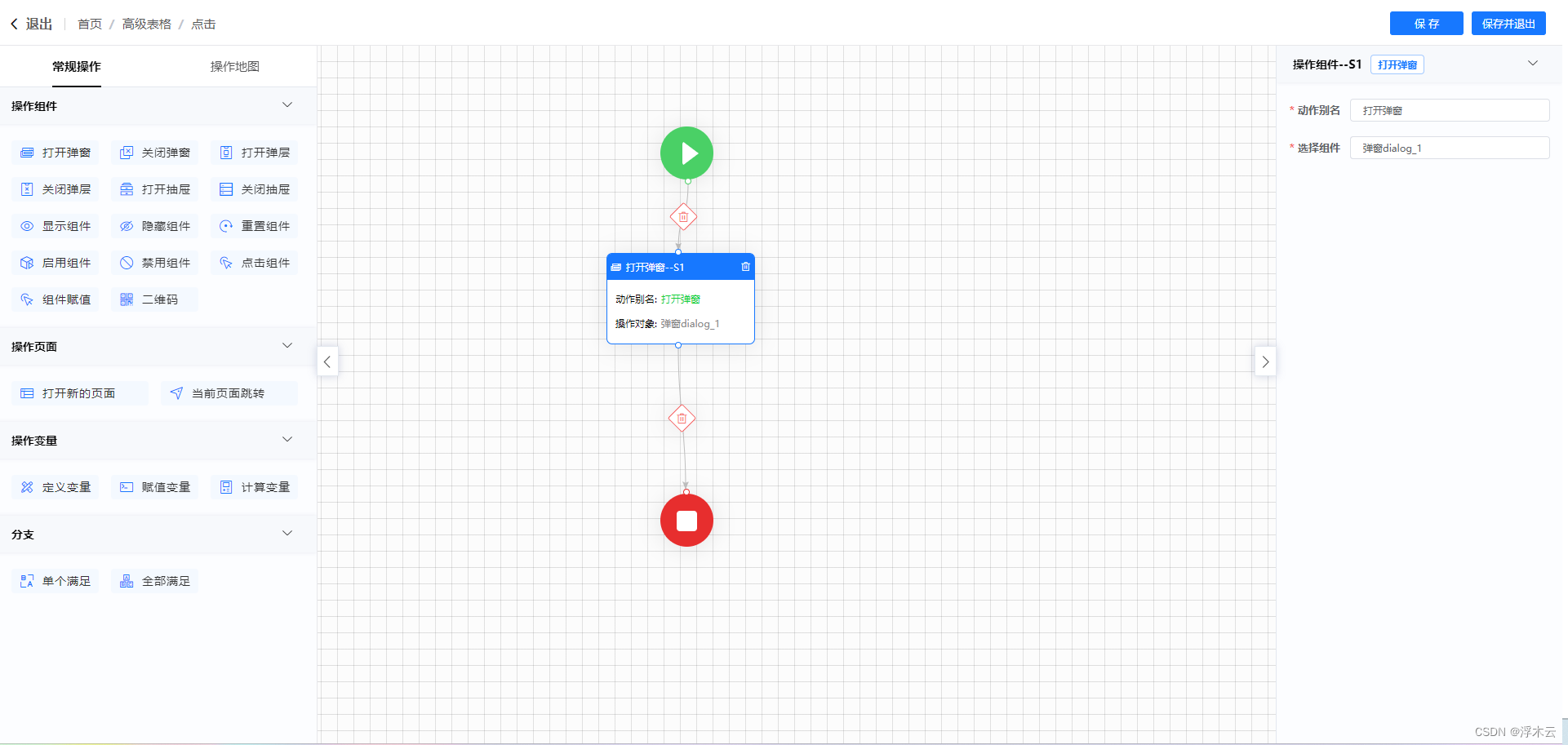 可以根据页面需要交互的逻辑链来自定义编写自己需要实现的页面交互方式,例如我需要在点击编辑按钮的时候打开编辑弹窗,则可以直接在事件编排中进行设计(如需要打开弹窗,则需要页面组件中已经有待弹起的弹窗)