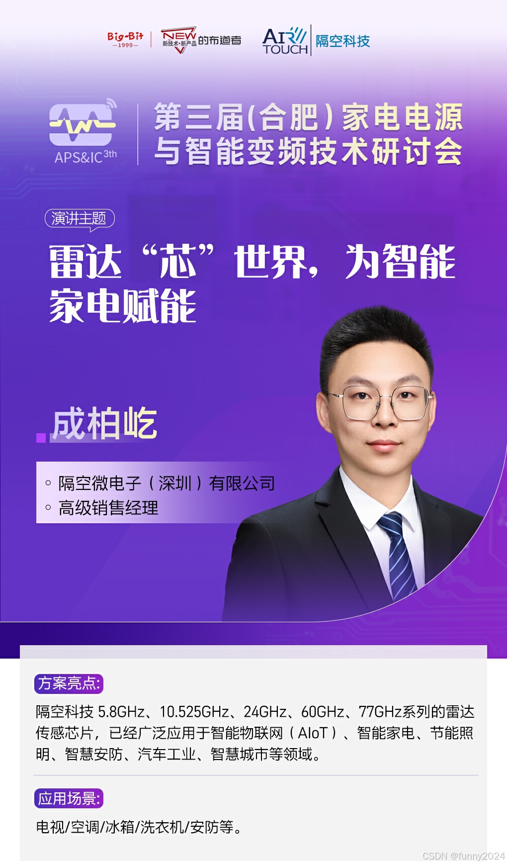 隔空科技的高级销售经理成柏屹带来《雷达“芯”世界,为智能家电赋能》演讲,多角度展示隔空科技5.8GHz、10.525GHz等一系列雷达传感芯片在智能家居场景中的应用。