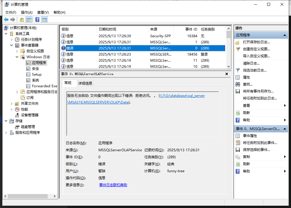 在中间的日志列表中,您会看到大量的条目。请寻找“来源”为 “MSSQLServerOLAPService” 的错误(红色感叹号图标)。