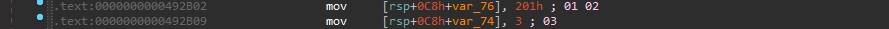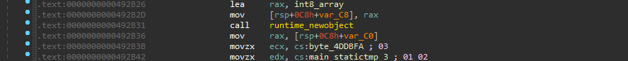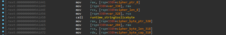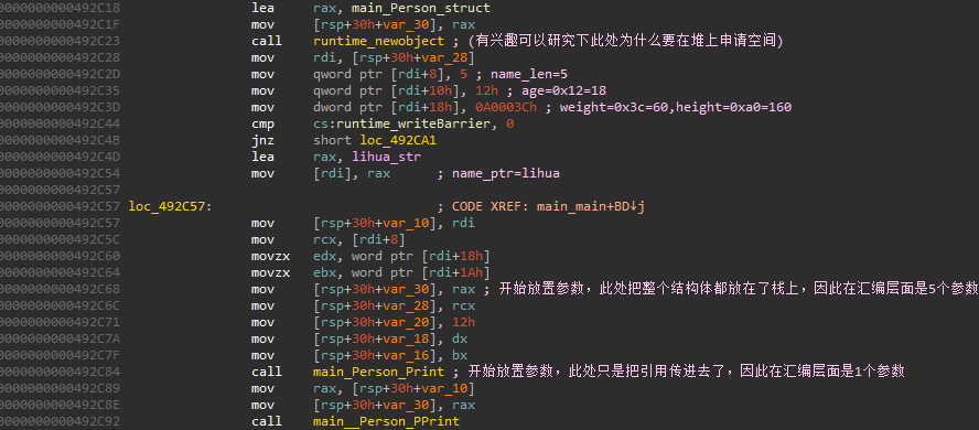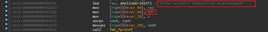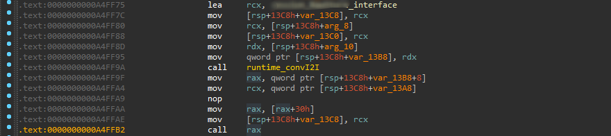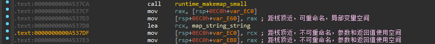 Go统一通过栈传递参数和返回值,这些空间由调用者维护,返回值内存会在调用前选择性的被初始化,而参数传递是从左到右顺序,在内存中从下到上写入栈,因此看到mov [rsp + 0xXX + var_XX], reg(栈顶)时就代表开始为函数调用准备参数了,继续向下就能确定函数的参数个数及内容:
