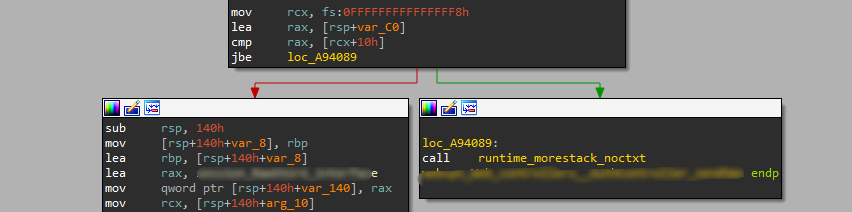 在调用runtime·morestack*函数扩展栈后会重新进入函数并进入左侧分支,因此在分析时直接忽略右侧分支即可。