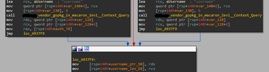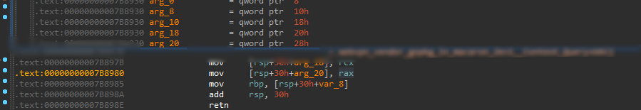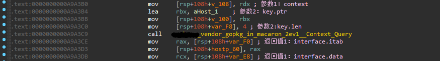 如图,mov [rsp+108h+v_108], rdx即表示开始向栈上传第一个参数了,从此处到call指令前都是传参,此处可见在汇编层面传了3个参数,其中第2个和第3个参数为Go语言里的第二个参数,call指令之后为返回值,不过可能存在返回值未使用的情况,因此返回值的个数和含义需要从函数内部分析,比如此处的Query我们已知arg_0/arg_8/arg_10为参数,那么剩下的arg18/arg20即为返回值: