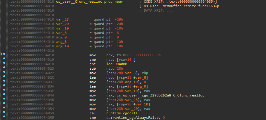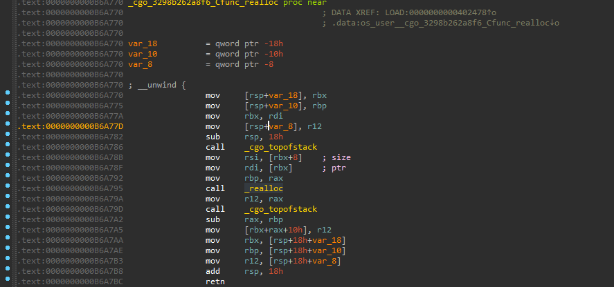 此处它调用了libc的void* realloc(void*, newsize),在Go侧它封装成了os_user__Cfunc_realloc,在该函数内部参数被封装成了结构体并作为指针与函数指针一起被传入了cgocall,而函数指针即_cgo_3298b262a8f6_Cfunc_realloc为中间层负责解包参数等并调用真正的C函数: