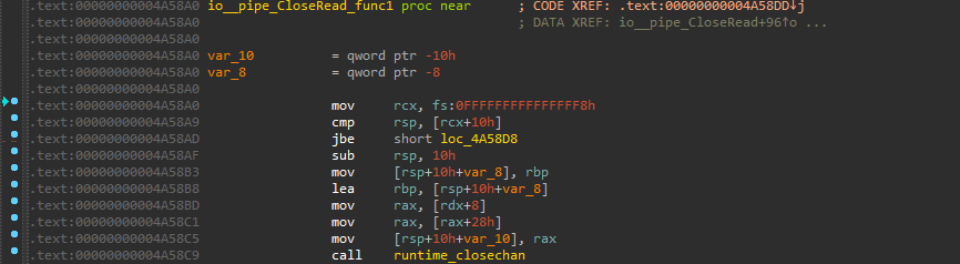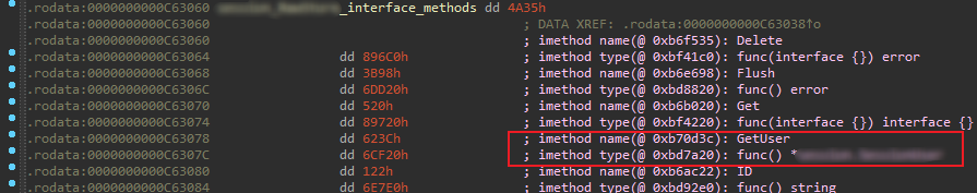 在逆向时工具会将其解析为类型名__方法名或类型名_方法名,因此遇到此类名称时我们需要注意它的第一个参数是隐含参数,类似C++的this指针,但Go的方法定义不仅支持传引用,也支持传值,因此第一个参数可能在汇编层面不只占一个机器字,如:
