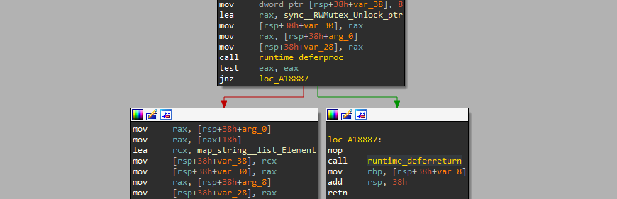 这里它第一个参数代表延迟函数参数字节大小为8字节,第二个参数为函数指针,第三个参数为延迟执行函数的参数,若创建失败会直接返回,返回前会调用runtime_deferreturn去执行其他创建的延迟执行函数,一般我们是不需要关注该语句的,因此可以直接跳过相关指令并向左侧继续分析。