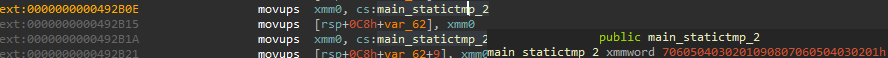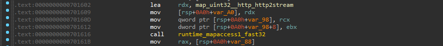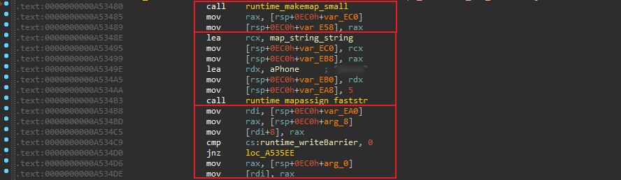 事实上更常见的是上面这些函数的同类函数,它们的后缀代表了对特定类型的优化,例如如下代码,它首先调用makemap_small创建了一个小字典并将其指针存于栈上,之后调用mapassign_faststr传入一个字符串键并获取一个槽,之后将数据写入返回的槽地址里,这里就是一个创建字典并赋值的过程: