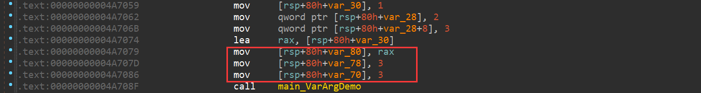 这里先将1,2,3保存到rsp+80h+var_30开始的位置,然后将其首地址,长度(3),容量(3)放到栈上,之后调用VarArgDeme函数。