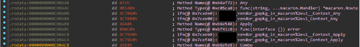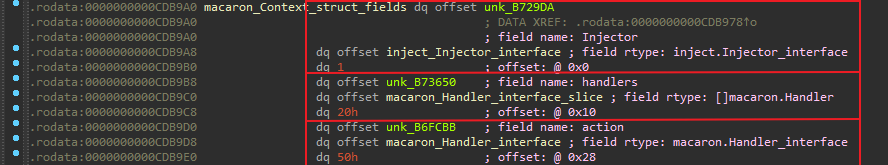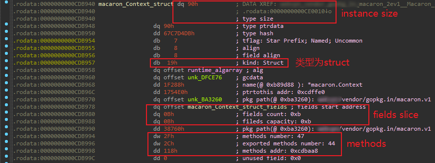 如上可见Context含44个导出方法,3个未导出方法,位置已经被计算出在0xcdbaa8,因此可转到方法定义数组: