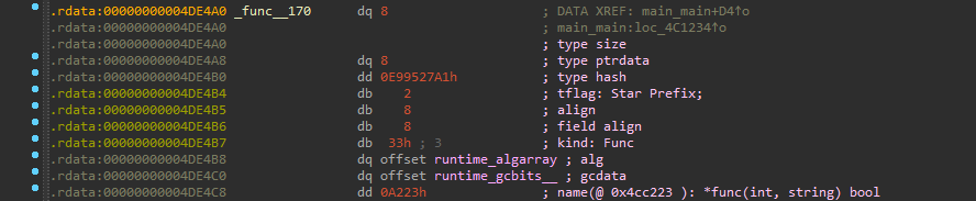 尽管是编译型语言,Go仍然提供了一定的动态能力,这主要表现在接口与反射上,而这些能力离不开类型系统,它需要保留必要的类型定义以及对象和类型之间的关联,这部分内容无法在二进制文件中被去除,否则会影响程序运行,因此在Go逆向时能获取到大量的符号信息,大大简化了逆向的难度,对此类信息已有大量文章介绍并有许多优秀的的工具可供使用,例如go_parser与redress,因此本文不再赘述此内容,此处推荐《Go二进制文件逆向分析从基础到进阶——综述》。