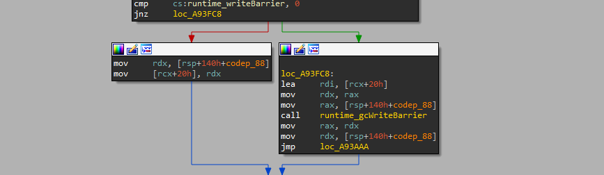 Go拥有垃圾回收,其三色标记法使用了写屏障的方法保证一致性,在垃圾收集过程中会将写屏障标志置位,此时会进入另一条逻辑,但是我们在逆向分析过程中可以认为该位未置位而直接分析无保护的情况: