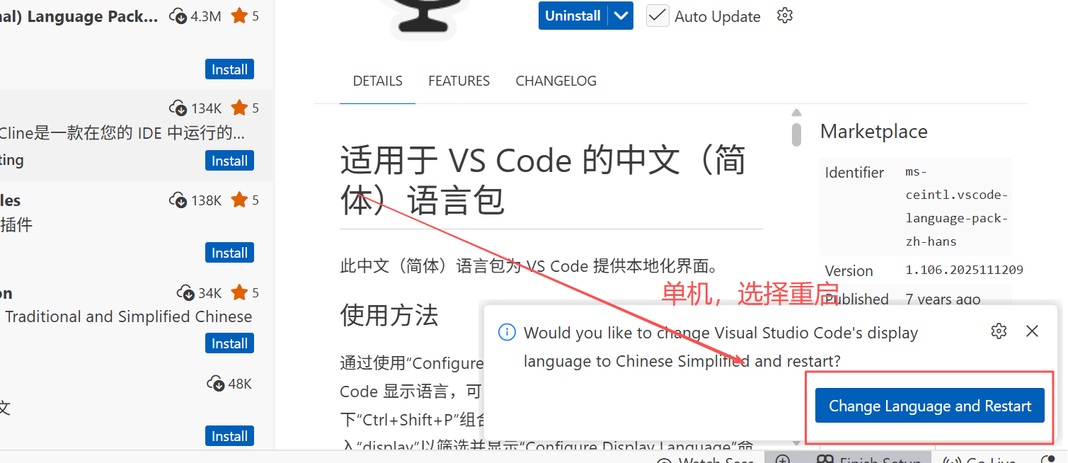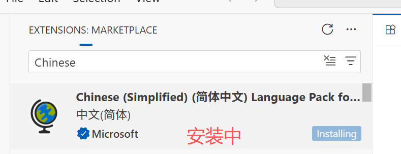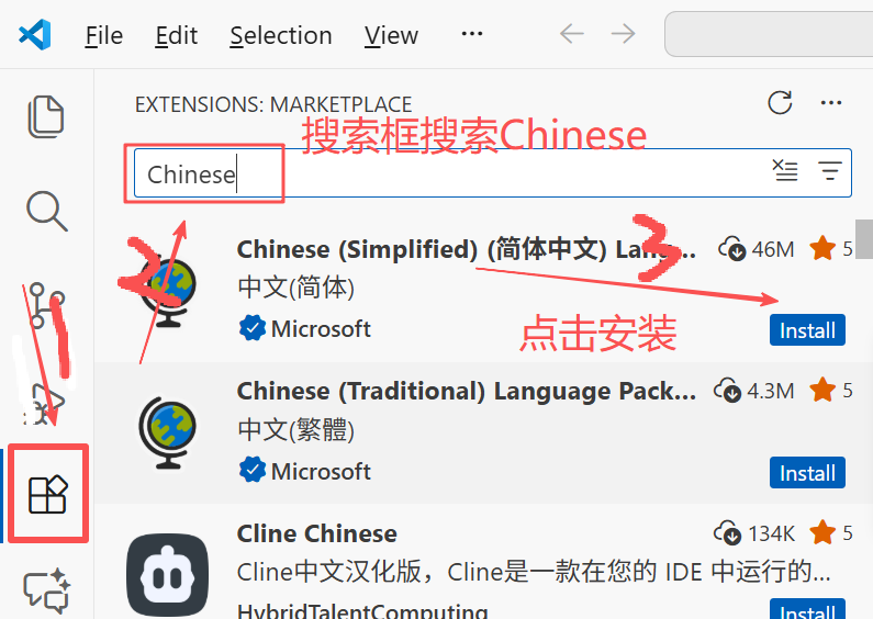 当你搜索“Chinese”,会出现中文汉化插件,点击安装"install"即可。