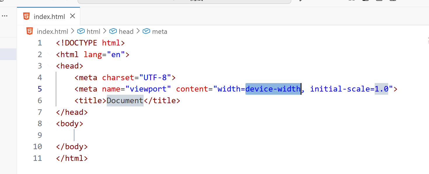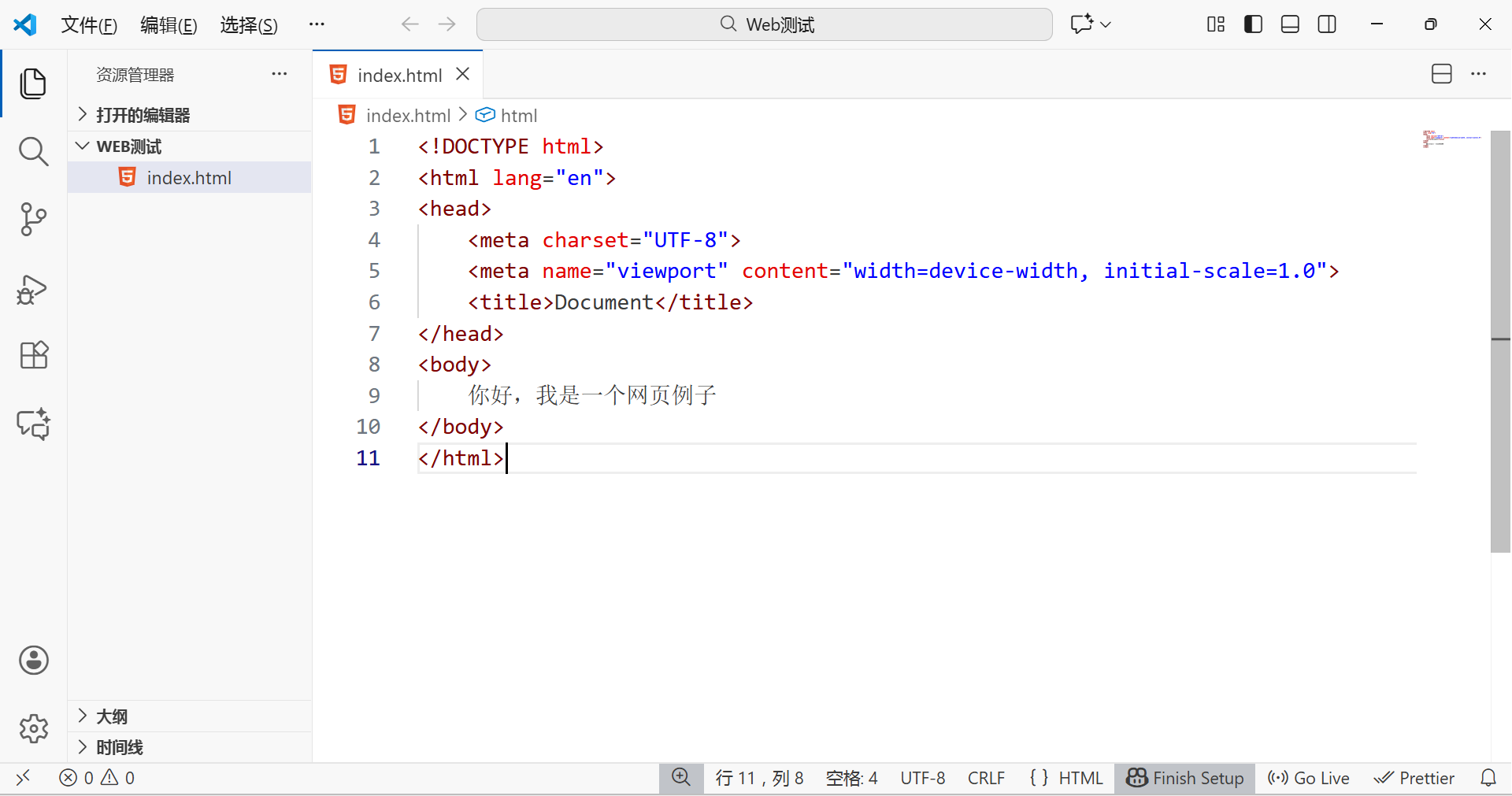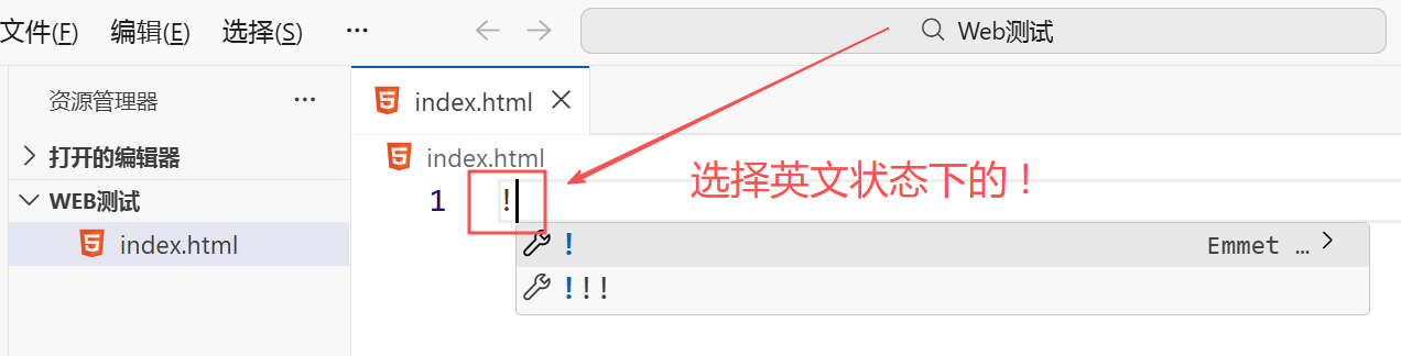 在index.html中,输入 英文状态下的“!”,然后回车,此时网页的骨架就出来了。